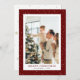Simple custom red photo Christmas cards featuring falling snow, snowflakes and stars. Easily personalise this photo Christmas card with your favourite image, a family name and text.