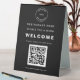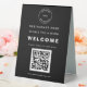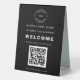Simple Restaurant Logo Menu QR Code Welcome Black. Welcome customers to your restaurant and invite them to scan your QR code to take them to the menu. Simply replace the sample placeholder images with your company logo and your QR code, and easily personalise the text. The same design is on the back.