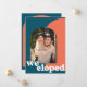 Retro 70s style We Eloped announcement and casual party invitation in peacock blue and papaya orange featuring your photo.