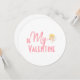 Soft white, finished with decorative pink text accompanied by young cupid. On the back, you can customise with your own personal message. Background colour is customisable.