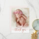 Modern Elegant Calligraphy Rose Gold Script Photo Newborn Baby Girl Thank You Card. Features a beautiful "thank you" text in a handwritten calligraphy swash tail font script in faux rose gold foil (or blush pink foil). At the reverse side pre-made personal message on blush pink background. Great for baby girl. Easy to personalise with your baby photo and details.