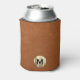 Modern can cooler features a brushed metallic gold monogram emblem on a sable brown distressed leather background with your initial in black classic block typography for a clean luxury look.