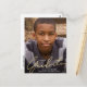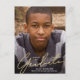 This simple, modern graduation postcard features a faux gold foil script overlay and full photo. On the front, "Graduate" is displayed along the bottom in handwritten script over a large, vertical photo. Add your graduate's name and photo, graduation year, and school to the front. On the back, you can write a longer message to recipients and/or include graduation party details.