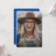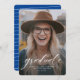 A simple classic script "graduate" in white accentuates a single vertical photo of your grad. This graduation announcement works for both college or high school graduates and is simple enough to let your photo shine. It's a timeless design and also features a striped backer with a customisable colour (default is a classic shade of bright blue).