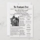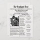Modern script newspaper wedding save the date with three photo, photo of the groom and the bride when they were kids and when they are grown up.