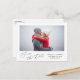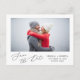 This simple black and white save the date postcard features a large photo and modern calligraphy. On the front of the postcard, you can add a large landscape photo. Below the photo, "Save the Date" is written in pretty script lettering on the left. To the right, add your names, wedding date, and wedding location. The white background colour and the black text colour can be changed if desired. The back of the postcard includes room for wedding details.