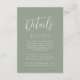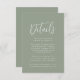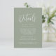 Modern wedding details cards featuring your wedding details displayed in white lettering with a sage green background. Add details such as hotel accommodations, welcome reception information, wedding website, etc. Designed to coordinate with our Simple Script wedding collection.