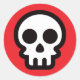 Simple skull logo on red background, round sticker