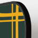 Modern personalised custom colour pickleball paddle for the left-handed pickleball player featuring sporty stripes and a name or monogram in an editable classic font and colours (shown in changeable green and gold). COLOR CHANGES: Change any text, stripes or background colours or add a styled graphics background by clicking on the EDIT tab in the PERSONALIZE section to create your own custom design. PADDLE OPTIONS: Choose from Black, Tan or White edging and grip colours on the ordering page. ASSISTANCE: For help with design modification or personalisation, colour change, transferring the design to another product or if you would like coordinating items, contact the designer BEFORE ORDERING via the Zazzle Chat MESSAGE tab below or email makeitaboutyoustore@gmail.com.