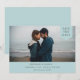 Simple traditional typography, photo tag, wedding save the date card. Design features, single horizontal photo, grey typography and powder blue colour backgrounds.
