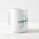 Trending towards simple styling with designer appeal, this modern mug design features your name spelled out in a handwritten calligraphy script with leading and trailing tails to add a stylish look. Your first and last initials are presented in a modern industrial serif type face in light aqua teal beneath the calligraphy. The result is stylishly you! PLEASE NOTE: When personalising your name on this item, be sure to leave the box symbols before and after your name. This is what causes the lovely tails to print before and after your name.