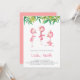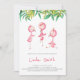 Simple and cute tropical flamingo triplets baby shower invitation perfect for summer. The little baby birds are under a canopy the tropical greenery leaves. Illustrated and designed by Patricia Alvarez.