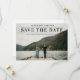 A modern wedding photo Save the Date card featuring a full bleed horizontal photo with clean and chic editable text on the front. The back has removable wedding website text for guests to receive more information. Click the edit button to customise this design.