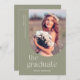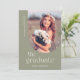 This modern graduation photo card features elegant typography and an off-centre, upside down arch photo frame. On the front, "The graduate" is written in a simple and trendy font below the photo. The graduate's name is centred underneath the typography, while the graduate's school and graduation year are written vertically along the left side of the photo. The typography is light cream against a sage green background. The back of the graduation card includes an optional template to add graduation party details.