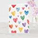 This greeting card shows watercolor hearts scattered across a white background in a loose, easy pattern. The hearts come in many sizes, from small accents to larger ones that catch your eye as you look around. Colors move through reds, oranges, yellows, greens, blues, and purples, with some hearts darker and others light and see-through. You can see the paint softly bleeding at the edges, which gives each heart a gentle, washed look. There aren’t any people or objects—just a field of hearts that feels like a simple reminder that love can show up in lots of different ways. There’s no text on the front, so the design leaves room for your own words inside. It feels meaningful to give because it works for romance or close friendship without being too specific 🥰❤️.