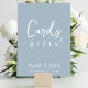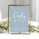 This design features wedding simple modern sign signage, cards and gifts quote saying, minimalist minimal dusty dark blue, great for reception guest bar tabletop sign, a modern calligraphy script text font, elegant trendy stylish typography font, simplistic elegance bar wedding décor, beer wine cocktails spirits list, an elegance simplistic reception guest sign, a custom customise reception signs