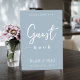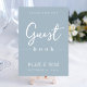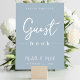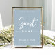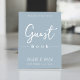 This design features wedding simple modern sign signage, guestbook guest book quote saying, minimalist minimal dusty blue, a reception guest bar tabletop sign, dusty blue minimalist minimal style, modern calligraphy script text font, an elegant trendy stylish typography font, an elegance simplistic reception guest sign, a guest book modern style, a custom customise reception signs