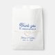 Elegant, modern, minimalist white and blue wedding thank you favour bag with gold rope heart and simple calligraphy script.