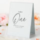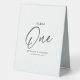 Wedding table number tent sign featuring a simple white background that can be changed to any colour, the table number "one" in a elegant script font, the couples names, and the date.