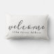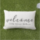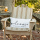Modern outdoor welcome pillow features a simple black and white typography design with "welcome" and custom address presented in modern black script on a white background.