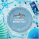 This cute design features a simple blue animal kids children's birthday party décor, a cute pool party water ocean, with watercolor shark fish sea animal, a blue custom paper party plate, a cocktail tableware, table dinner dessert plate, with wild wildlife nautical marine life, with sharks fish marine grey black, a fun whimsical festive picnic invite, great for summer fun swimming swim party, for backyard summer party supplies