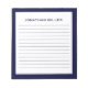 A professional lined notepad with a minimalist design in a navy blue and white. Custom monogram initial and name on a simple white background, framed by a navy border. Personalise using the fields provided or use the 'message' button to contact the designer for help.