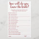 Who best knows the bride-to-be? Simple "How Well Do You Know the Bride?" keepsake bridal shower game featuring a fun, casual hand-lettered script. The classic design includes a modern hand-lettered quote typography overlay. For other colours or matching products, please visit the JustFharryn Zazzle store, or contact the designer, c/o Fharryn@yahoo.com All rights reserved. #bohochic #zazzlemade"