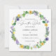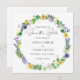 This is a simple, sweet rustic wildflower wedding save the date invitation. The design features a wreath made with a variety of spring wildflowers including yellow daffodils, purple pansies, clovers, lavender, sweetpeas, dandelions, tulips and fern and ivy greenery. It also includes a few ladybirds, a sweet dragonfly and space for a message and photo on the back.