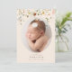 This simple, beautiful photo birth announcement features an elegant oval shaped vertical photo on the front and cascading colourful vintage style botanical wildflowers falling from the top, over the top of the baby's photo. "Introducing" your baby girl in elevated script font, and simple, classic storybook style font typography details for the baby's name and birth statistics including date, weight, and length. The back side offers an opportunity to send a personalised heartfelt family custom message and includes another photo, this time horizontal, for a total of two photos included on this customisable birth announcement template. All done in beautiful soft pastel shades of pink, coral, peach, green, blue, yellow, and red.