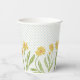 Bring in spring and summer with this charming paper cup design that features painterly illustrated yellow wild flowers with green stems and leaves against a subtle background of off-white with a pattern of pale blue polka dots.