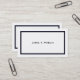 A simple business card with a dark blue band framing a white background and black print. Customised details that you'll want to include are on the reverse side, which also has the dark blue band, a white background and black print.