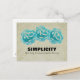 A postcard with an inspirational quote which says: Simplicity the key to successful living. Illustrated with teal watercolor roses on a faded tan damask pattern.