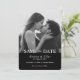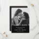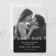 This simplistic black tie black photo save the date announcement captures the essence of simplicity and sophistication. This design features a black and white photo with black blocking at the bottom and white serif and script font on the front and a muted black simple geometric pattern on the reverse.