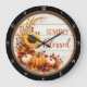 This beautiful autumn-themed clock features a central image of pumpkins and fall leaves, adorned with a sunflower and stalks of wheat. The text "SIMPLY Blessed" is written on a white wood-panel background. The clock has a black outer rim with white numbers 1-12.