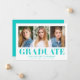 Announce your graduate's achievement with these minimalist graduation announcements, featuring three of their favourite photos and bold turquoise "Graduate" lettering. This modern design offers a sleek and stylish way to celebrate their big day. Personalise the announcement with the graduate's name, school name, and graduation year for a unique touch. Perfect for high school and college graduates, these multi-photo announcements are a beautiful and contemporary way to share their success with friends and family.