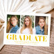 Announce your graduate's big achievement with these minimalist graduation announcements, featuring three of their favourite photos and bold yellow "Graduate" lettering. This clean and modern design allows for personalisation with the graduate's name, school name, and graduation year, creating a unique and memorable keepsake. Ideal for high school or college graduates, this multi-photo announcement perfectly captures their special moment while keeping it stylish and fresh. Share their success in a fun and eye-catching way with this vibrant and customisable graduation announcement.