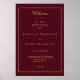 Dark burgundy wine background for simple, yet elegant typography based design. Couple's monogram footer. Goldenrod on medium wine hue. Reverses to solid burgundy colour with golden frame and monogram. Welcome foam board sign has varied fonts and single line embellishment under "Welcome". A rich look in colour, which works well with Victorian to modern styles.