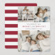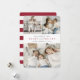 Spread merriment with our photo collage holiday cards, featuring three of your favorite photos -- two square and one horizontal rectangle. "Merry and Bright" is displayed in the center in cranberry red and charcoal gray calligraphy and block typography for a chic and elegant look. Personalize with two lines of custom text; we love it with your family name and the year, and your individual names listed beneath. Cards reverse to matching cranberry red and white stripes.