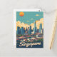Bring the vibrant energy of Singapore city, into your space with this stunning retro travel poster. Showcasing the city's iconic skyline under a dramatic sunset sky, this illustration features detailed architecture. Designed in a vintage postcard style with warm tones and classic lettering, it's perfect for adding charm to any home, office, or gallery wall. An ideal gift for Singapore city natives, visitors, or lovers of cityscape art.