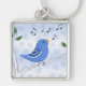 Musical notes float above the head of a cute little blue bird that is singing happily in a tree against a swirly blue sky in the original mixed media digital painting on this keychain.