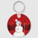 Christmas design with an illustration of a happy snowman singing with a microphone. Snow is falling, snowflakes everywhere, and a forest of pine trees can be seen in the background. This happy snowman design has cheerful white and red Christmas colour scheme with a touch of blue and orange.