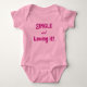 Girl's baby t-shirt with text that says Single and Loving it! written with pink text and shown on a pink snap t-shirt.