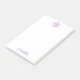 This sticky note pad features a bold digital painting of a single Lavatera flower bloom at the top of the page and a purple personalised name at the bottom edge in a scripted font.