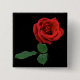 This elegant pin features an exquisite single scarlet red rose with three green leaves against a black background.