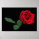 This elegant poster features an exquisite single scarlet red rose with three green leaves against a black background.