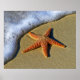 Striking beach photography, a bright orange starfish on the waters edge about to be covered by a gentle wave.