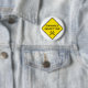 Sinkhole Inspector - white button pin with yellow warning sign style design and crossed rock hammers graphic.