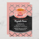 Elegant, trendy sip and see new baby invitations- Reads 'Please Join Our Sip & See to Welcome Little' at the top in deep pink with name of new baby below in chic, white script. Personalised new baby shower welcome party information in palest grey, including RSVP details. Framed in faux black chalkboard with faux silver glitter look edge. Vintage style, watercolor pink floral china teacup design adorns the top. Against faux metallic silver foil look, Moroccan quatrefoil pattern background on solid coral pink. Back has matching, solid pink background. Note: All images are printed. Not actual glitter, metallic foil, or chalkboard surface. Elegant, pink and silver quatrefoil sip and see baby girl invites ready to be personalised with your own custom details.
