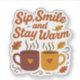 Keep cosy this fall with this “Sip, Smile and Stay Warm” design featuring two steaming mugs with hearts and autumn leaves.