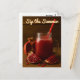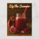 Send a burst of bold flavour with this striking pomegranate juice postcard! A mason jar brimming with deep red juice is surrounded by lush, jewel-like pomegranate seeds — all set against a rich wooden backdrop with refreshing water droplets.